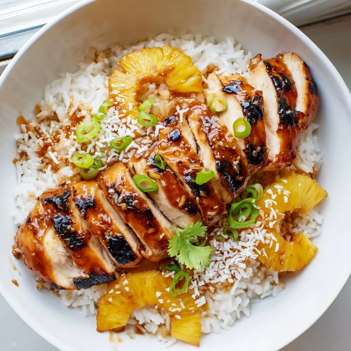 - Scoop that fragrant coconut rice into bowls and top with sliced chicken. Arrange pineapple cubes around the edges, then sprinkle with green onions, toasted coconut, sesame seeds, and fresh cilantro.
