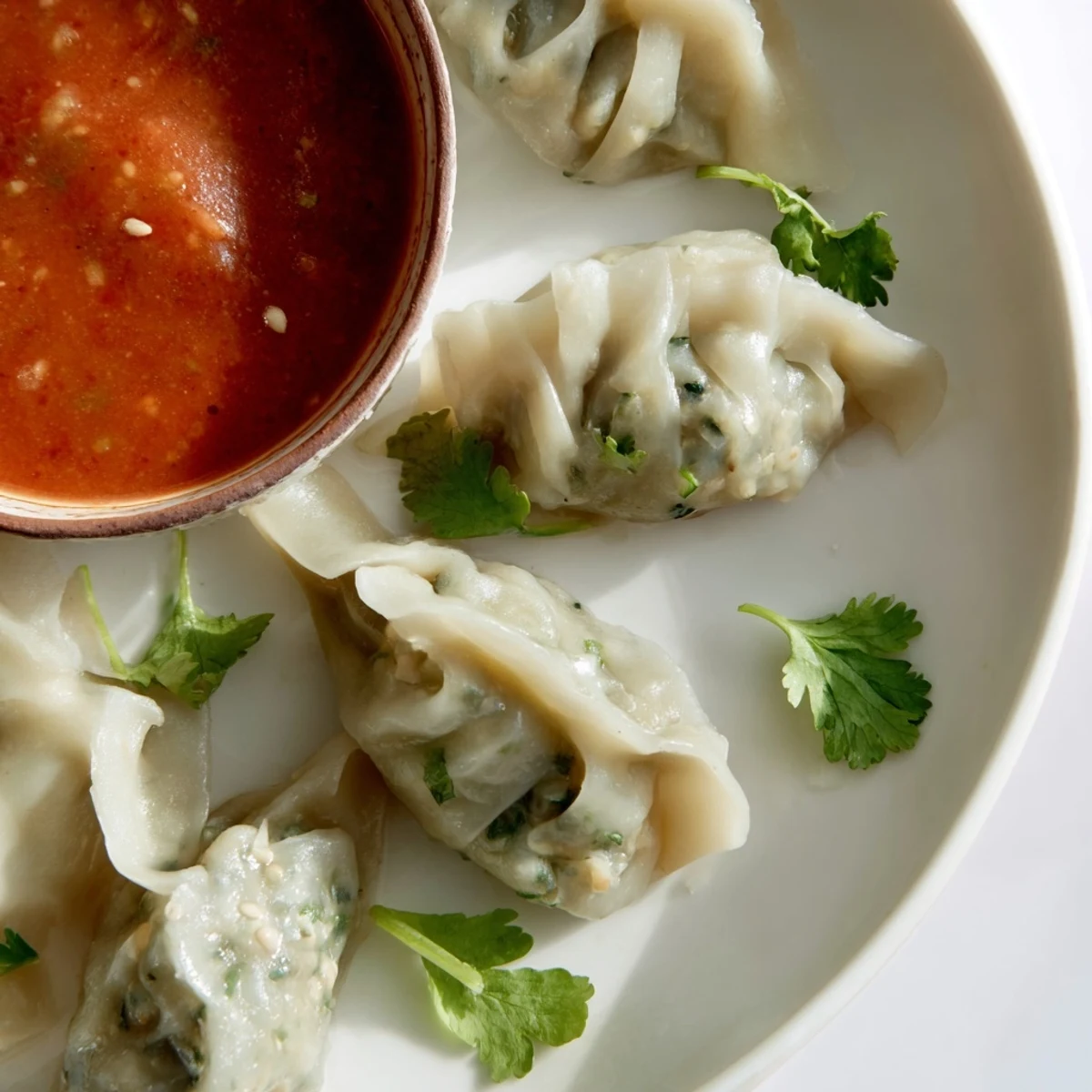 Pair these delicate dumplings with a zesty charred tomato sauce featuring roasted sesame seeds and fresh herbs. Each batch yields about 24 pieces, perfect for sharing as a main dish or appetizer.