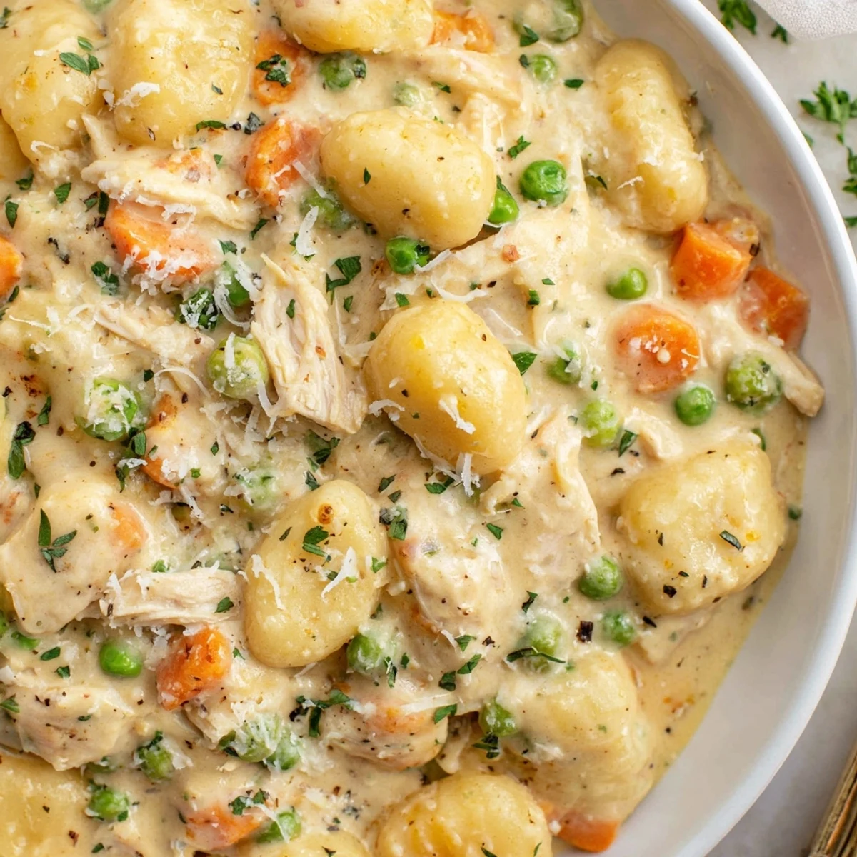 This satisfying one-pot dinner brings together tender shredded chicken, soft potato gnocchi, and classic pot pie vegetables in a velvety cream sauce. The gnocchi cooks directly in the flavorful broth, absorbing herbs like thyme and sage while creating a naturally thickened, golden consistency. Ready in just 45 minutes with minimal cleanup, this hearty dish delivers the familiar comfort of chicken pot pie with the added delight of Italian dumplings.