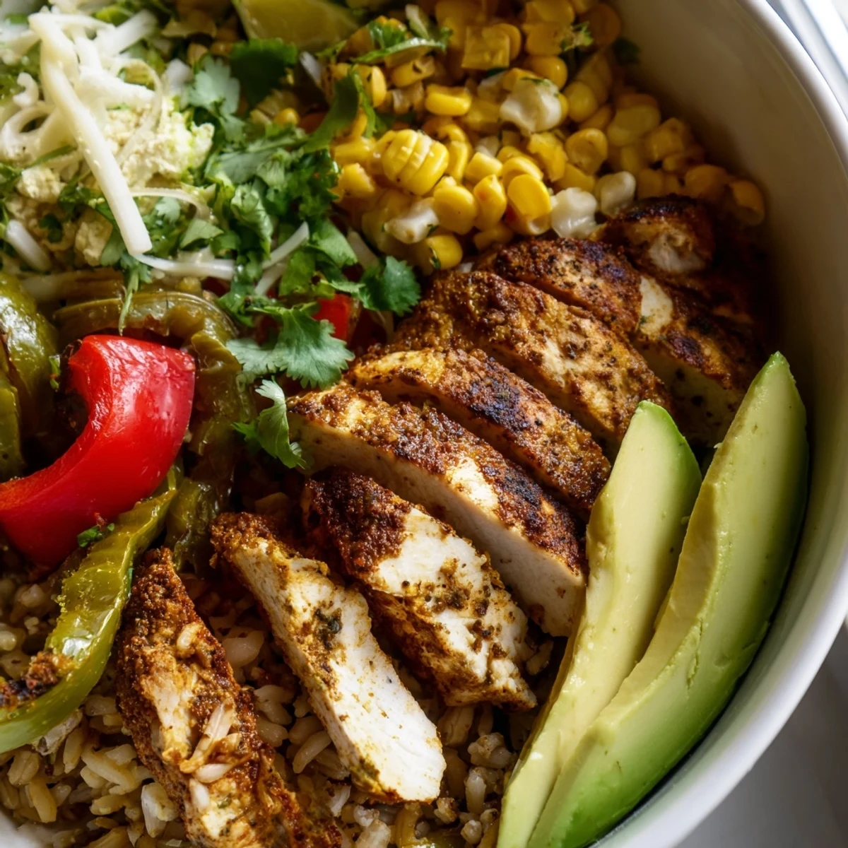 This satisfying Southwestern bowl brings together tender, spice-rubbed chicken with smoky roasted green chiles, sweet corn, and fresh vegetables. The hearty combination features seasoned protein sautéed with bell peppers and onions, then folded with cherry tomatoes and baby spinach just until wilted. Served over fluffy brown rice or quinoa and topped with creamy avocado, tangy cheese, fresh cilantro, and zesty lime wedges, each bowl offers a perfect balance of protein, fiber, and bold regional flavors.