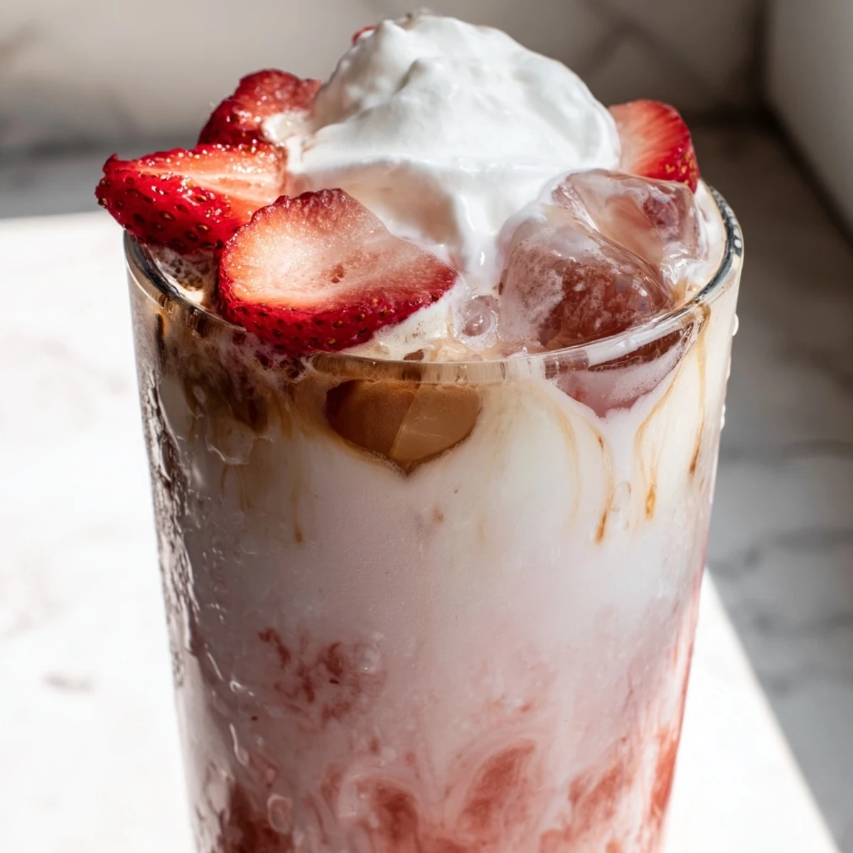 This chilled beverage combines fresh strawberry puree with creamy milk and cold-brewed espresso for an irresistibly smooth summer treat. The natural sweetness of ripe strawberries balances perfectly with rich dairy, creating a marbled effect when poured over ice.
